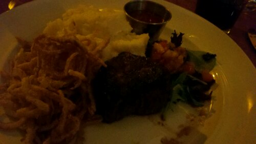 for dinner, i had suggested we try somewhere new and the family gathered at George Martin’s Grillfire in The Hotel at Arundel Preserve which is near Arundel Mills. we had a fantastic dinner and time. it’s probably described as a new american cuisine restaurant. i got the petite filet since i was still somewhat full even after a post lunch nap! others got the meatloaf (a popular choice), ribs, crab cakes, avocado cobb salad, and the salmon wrap. everyone seemed to enjoy their including the free cheese bread they brought out time and time again after we ate the loaves. the wait staff was good and attentive and even brought us out some free desserts for the table after bee told them it was my birthday.